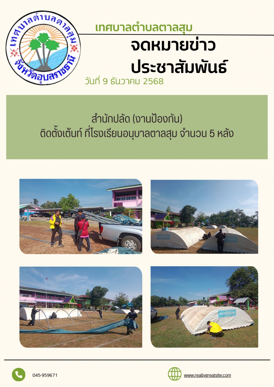 นางวรรณภา แก้วพรหม นายกเทศมนตรีตำบลตาลสุม มอบหมายให้. สำนักปลัด (งานป้องกันฯ) ออกติดตั้งเต็นท์ โรงเรียนอนุบาลตาลสุม วันอังคาร, 09 ธันวาคม 2568 11:08 พิมพ์ อีเมล แสดงความคิดเห็น ***กรุณาแสดงความคิดเห็น ด้วยความสุภาพ เคารพต่อสิทธิของผู้อื่น ไม่ละเมิดต่อกฎหมาย และศีลธรรมอันดีของสังคม ข้อความ * ใส่ความคิดเห็นของคุณ... ชื่อ * อีเมล * URL เว็บไซต์ของคุณ (ถ้ามี) back to top