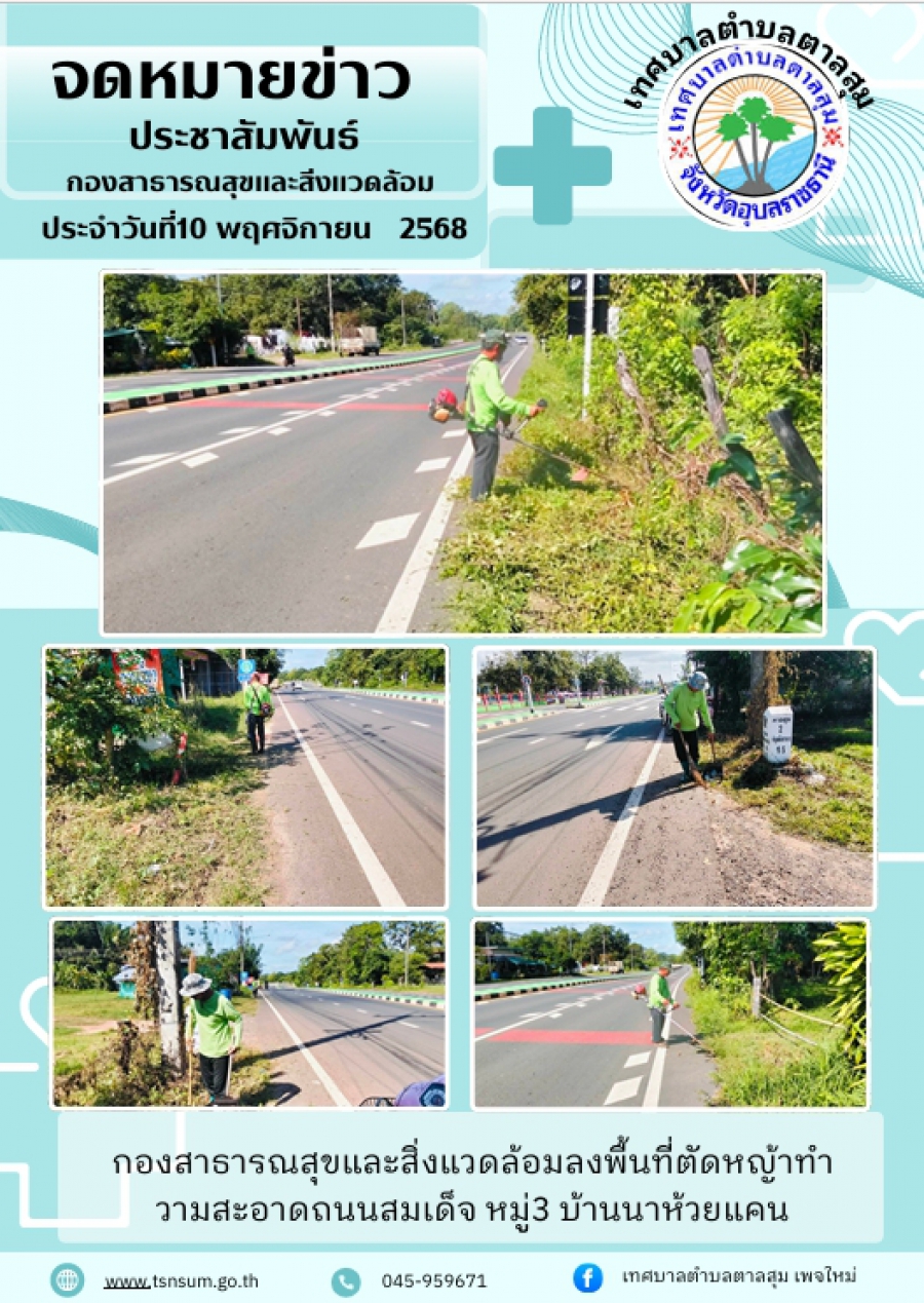 นางวรรณภา แก้วพรหม นายกเทศมนตรีตำบลตาลสุม มอบหมายให้กองสาธารณสุขและสิ่งแวดล้อม ลงพื้นที่ ตัดหญ้าทำความสะอาด บ้านนาห้วยแคน หมู่ที่3 วันจันทร์, 10 พฤศจิกายน 2568 14:03 พิมพ์ อีเมล แสดงความคิดเห็น ***กรุณาแสดงความคิดเห็น ด้วยความสุภาพ เคารพต่อสิทธิของผู้อื่น ไม่ละเมิดต่อกฎหมาย และศีลธรรมอันดีของสังคม ข้อความ * ใส่ความคิดเห็นของคุณ... ชื่อ * อีเมล * URL เว็บไซต์ของคุณ (ถ้ามี) back to top