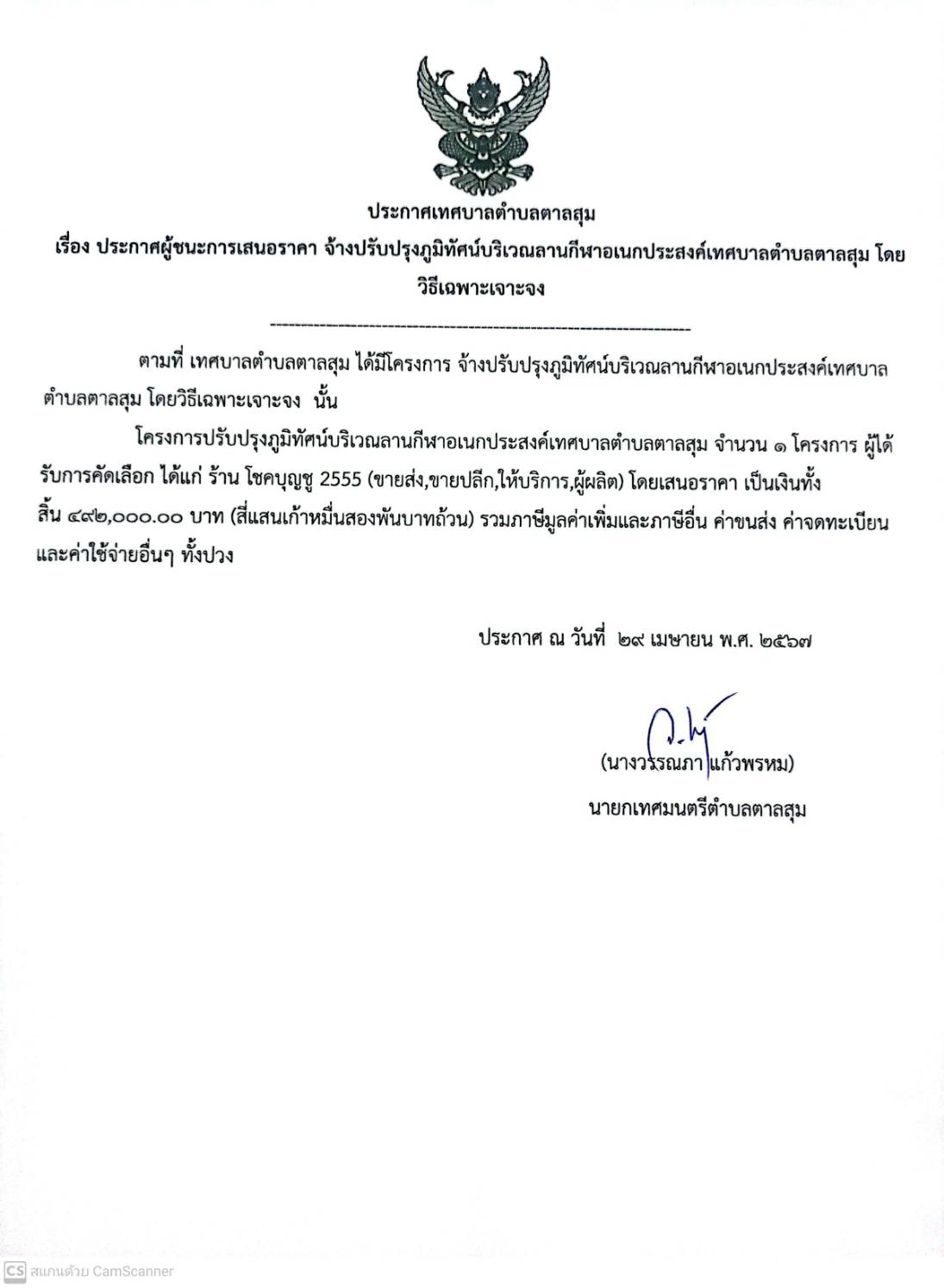 ประกาศผู้ชนะเสนอราคา จ้างปรับปรุงภูมิทัศน์บริเวณลานกีฬาอเนกประสงค์เทศบาลตำบลตาลสุม วันจันทร์, 29 เมษายน 2567 10:54 พิมพ์ อีเมล ดาวน์โหลดเอกสาร yyyyyy_1.jpg (196 Downloads) back to top